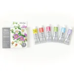 The Karen Klugein Botanical Set includes one 5ml tube each of Winsor lemon, scarlet lake, permanent rose, permanent sap green, manganese blue hue and Winsor violet (dioxazine).